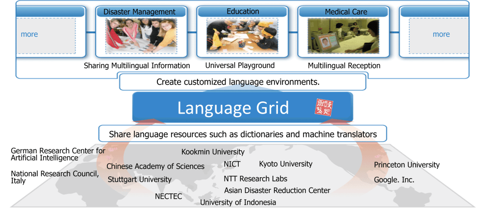We conducted global research activities with researchers in the US, Europe and Asia to promotethe Language Grid. We successfully operated the Language Grid at Department of Social Informatics, Kyoto University from 2007 and built the Asia-wide Language Grid by establishing several Language Grid Operation Centers in Thailand (2010) to collect Southeast Asian language services, in Indonesia (2012) to share Indonesia language services and Xinjiang, in China (2014) to accumulate Central Asian language services. These operation centers were federated with each other to share 225 language services for users. Moreover, we connected the language service infrastructures in ELDA/ELRA and US NSF projects that were built based on the Service Grid Server Software.